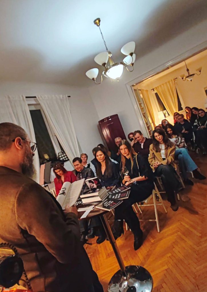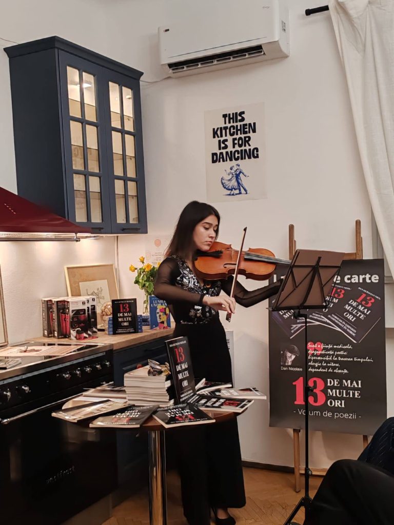 Încă de la intrare, atmosfera a avut ceva din eleganța caldă a unui salon artistic de altădată, unde oamenii nu vin doar să asculte, ci să participe. Invitații au umplut spațiul cu un murmur discret, acoperit din când în când de acordurile delicate ale violei Mădălinei Sima, care a oferit serii un timbru muzical aparte, tandru și profund. Muzica ei a însoțit lectura, legând poemele într-un fir continuu de vibrație și sensibilitate.